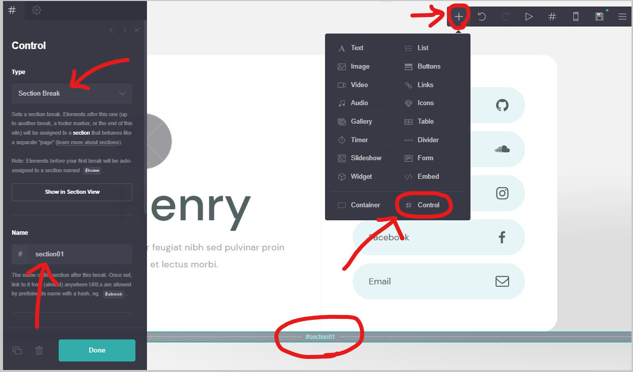 「新しい/別のページにジャンプ」ではなく、「同一ページ内の、リンク先へジャンプ(遷移)させたい」場合は、ControlのTypeで、「Section Break」ではなく、「Scroll Point」を選んでください。