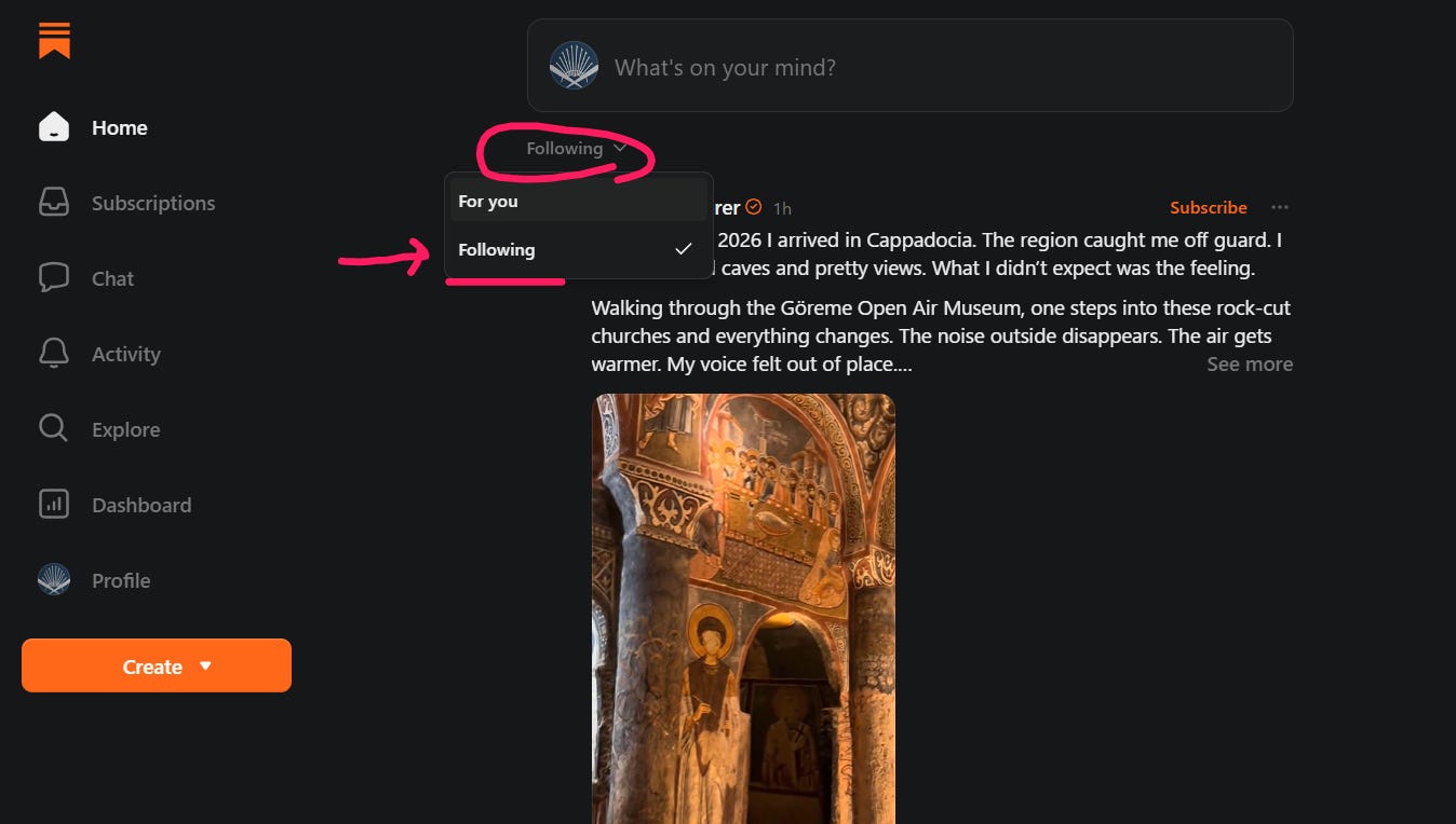 まず、Substackの内側にある「Xのようなタイムライン(Notes)」を流し見しています。