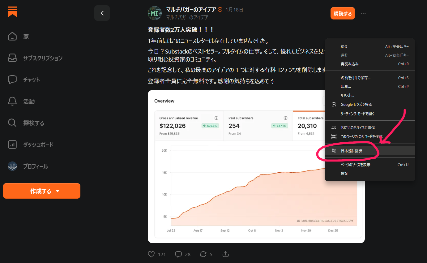 Substackを閲覧する際にはGoogleのChromeを利用しているので、Google公式の翻訳拡張機能を導入して、これで「英語記事⇒日本語」にして読んでいます。